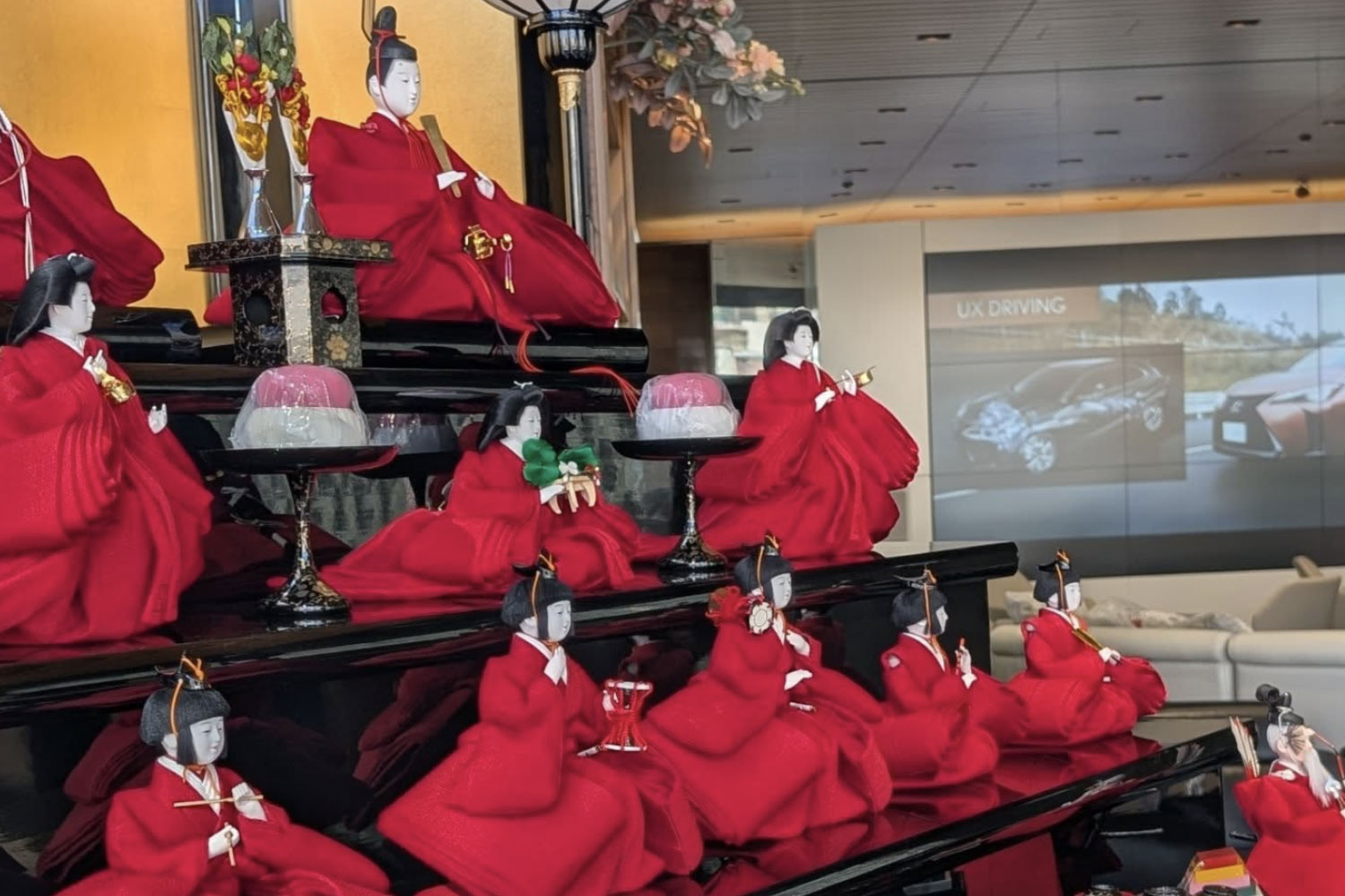 レクサス北大路の店内に、赤い七段飾りを展示